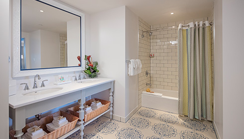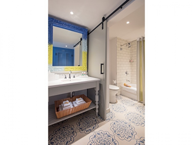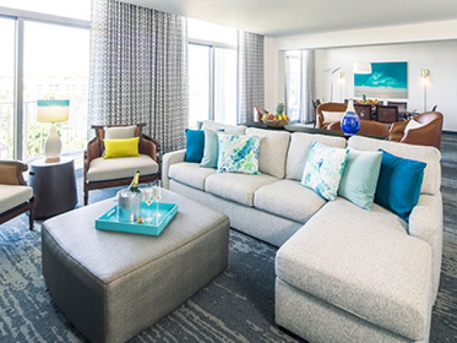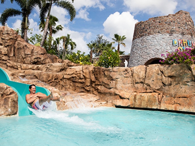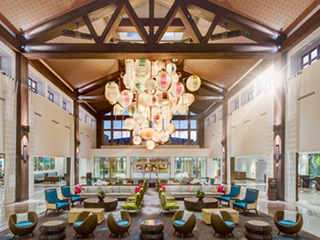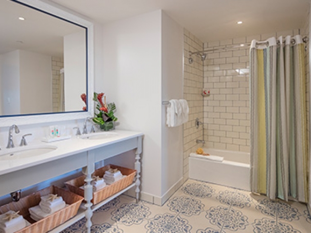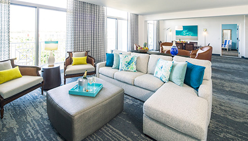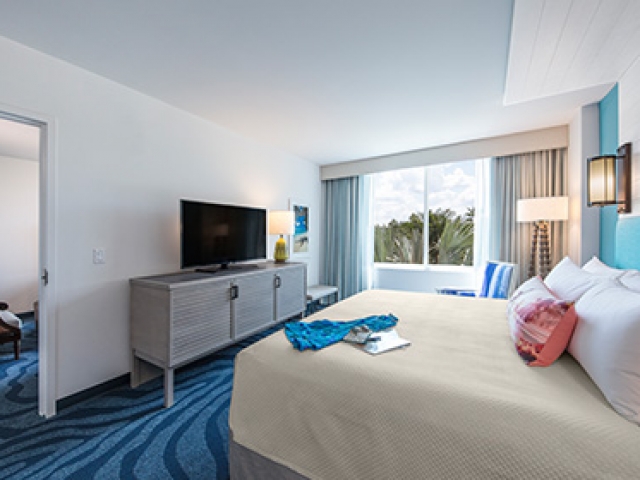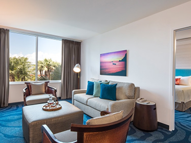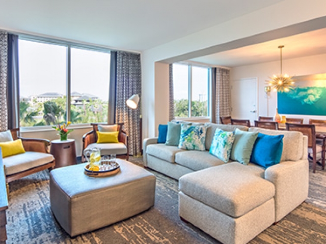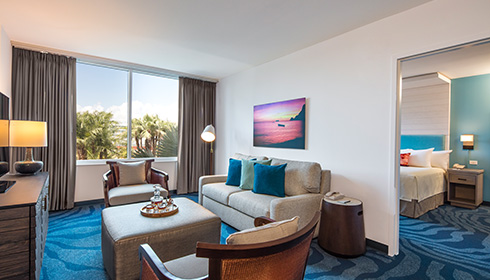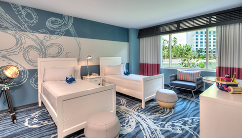 The Caribbean-inspired Loews Sapphire Falls Resort at Universal transports guests to a paradise where blue waterfalls cascade across lush grounds, and the invitation to cool relaxation is everywhere. Featuring a luxuriously landscaped 16,000 square foot, resort-style pool surrounded by cascading waterfalls as its centerpiece, Loews Sapphire Falls Resort captivates at every turn. From the ruins of the stone turret in the lobby to the inviting island charm of the 1,000 guest rooms and suites, guests will be surrounded by a vivid and textured haven that is old-world and chic while still modern and timeless.