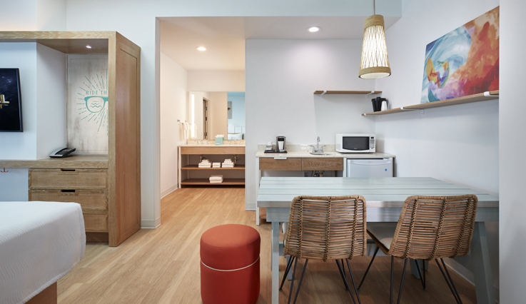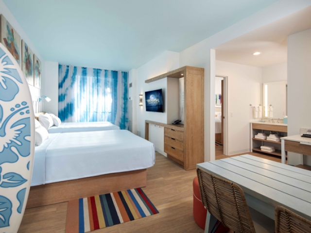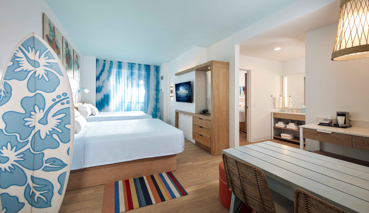 Universal’s Endless Summer Resort – Surfside Inn and Suites is now open. This fun, family-oriented Value hotel introduces extra affordability to your Universal vacation. The feeling here is relaxed and easy, with a cool surf vibe woven throughout. Here, guests enjoy exclusive theme park benefits like being able to breeze into The Wizarding World of Harry Potter™ and Universal’s Volcano Bay an hour before everyone else†. With complimentary transportation, it’s a quick hop between the parks and the hotel. In addition to beach-themed standard rooms, Surfside Inn and Suites features spacious, 2-bedroom suites that sleep up to six, making it the perfect spot for families of any size to experience a Universal Orlando Resort vacation.